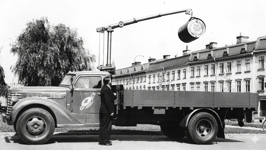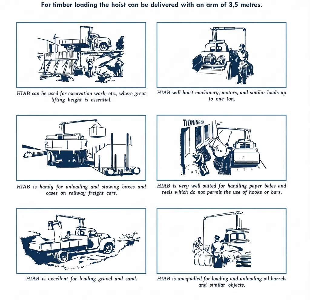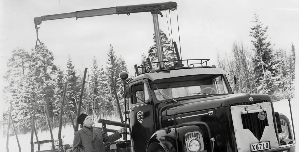 Lo que hoy nos parece estándar, en aquel entonces fue una revolución. La HIAB 190 fue la primera grúa hidráulica articulada del mundo lista para la producción en serie.